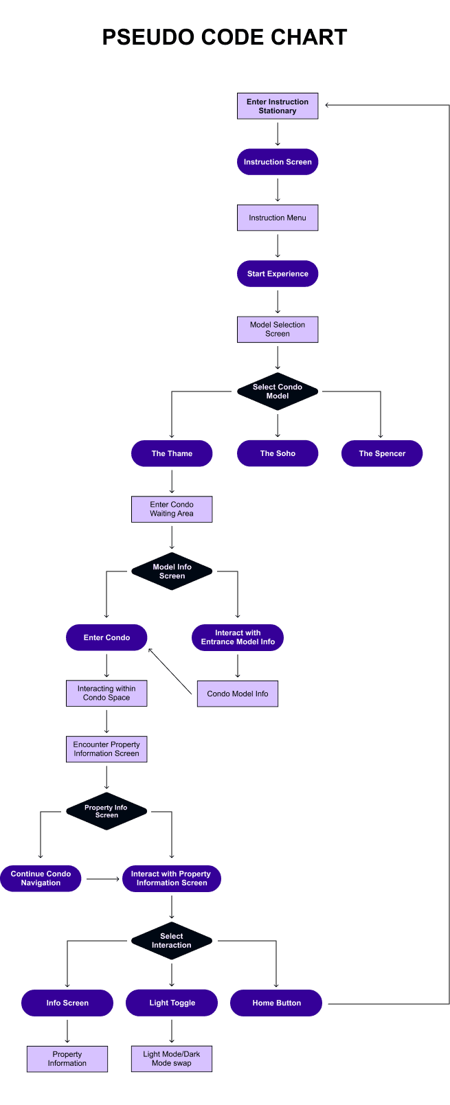 The flow chart is consisted of the main chart, and a subgraph that consist of the pseudo code of the interactive information display within the property.